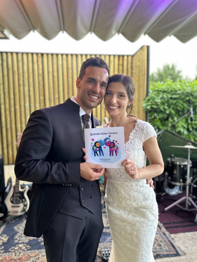 Nel loro giorno più bello, ogni ospite ha ricevuto una shopper con vari gadget, fra cui il libricino illustrato con la storia di come si sono conosciuti!