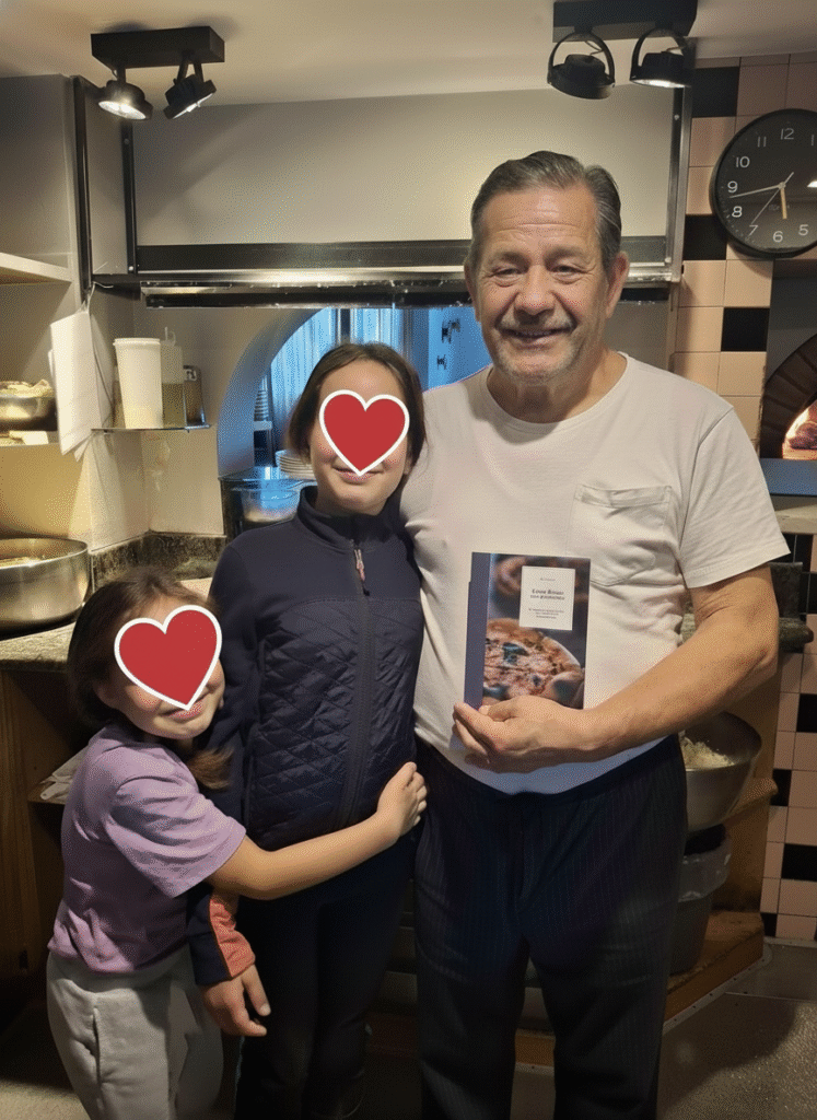 Con le nipotine, stringendo tra le mani il racconto di una vita dedicata ad impastare la pizza più buona del mondo.